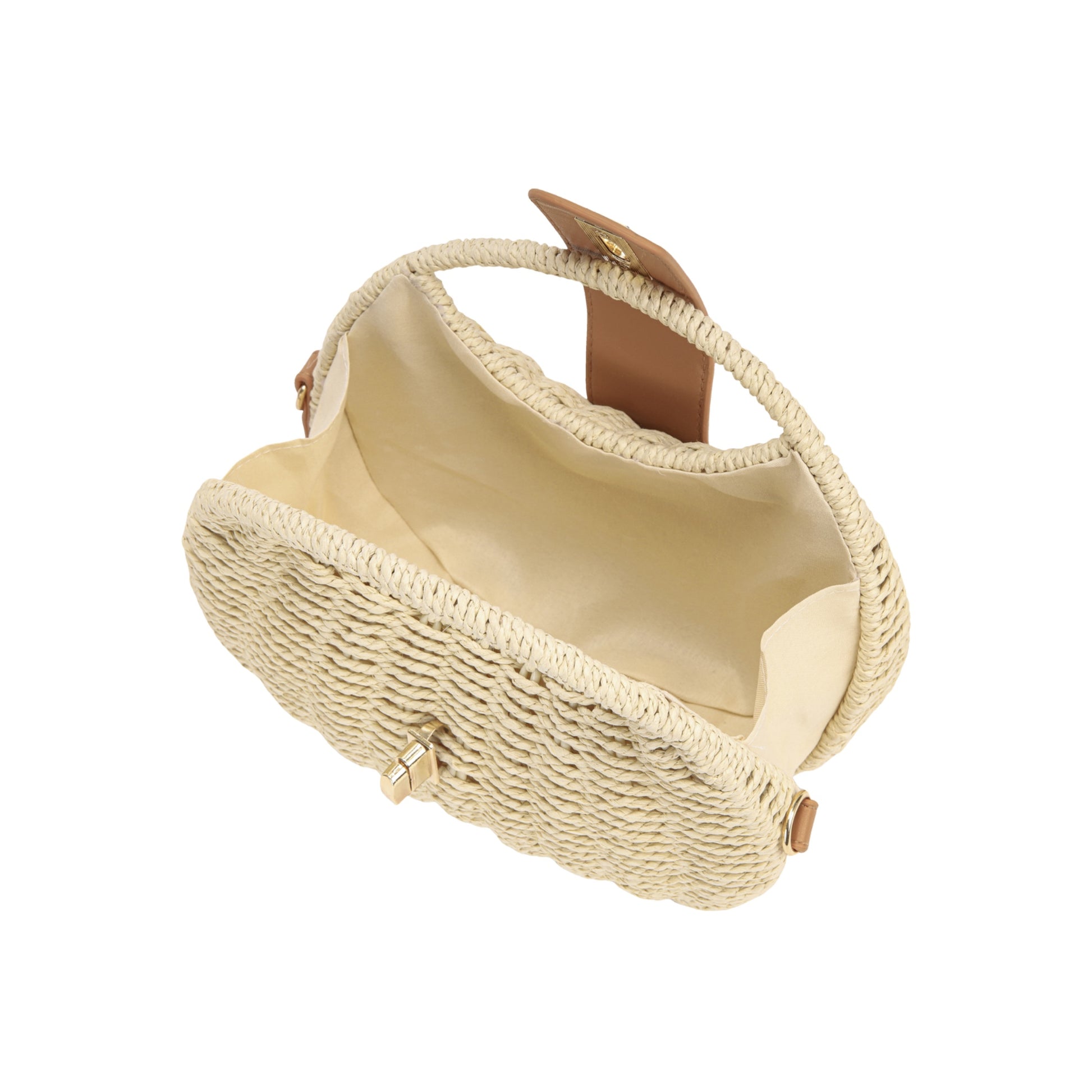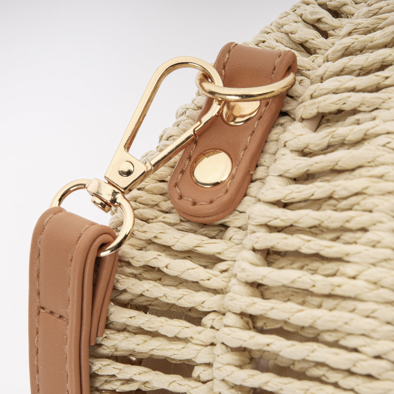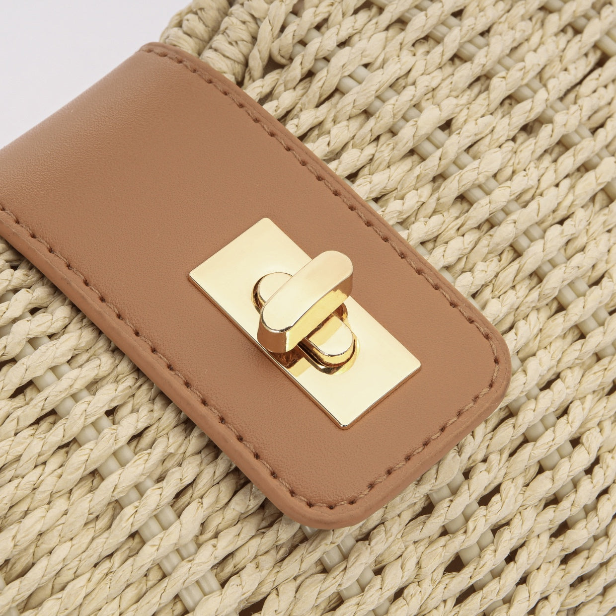 A Bolsa de Praia SP50106 é feita em palha sintética trançada, com design estruturado e acabamento sofisticado. Possui fecho metálico frontal, alça de mão e alça longa removível, permitindo usar tanto no ombro quanto transversalmente.