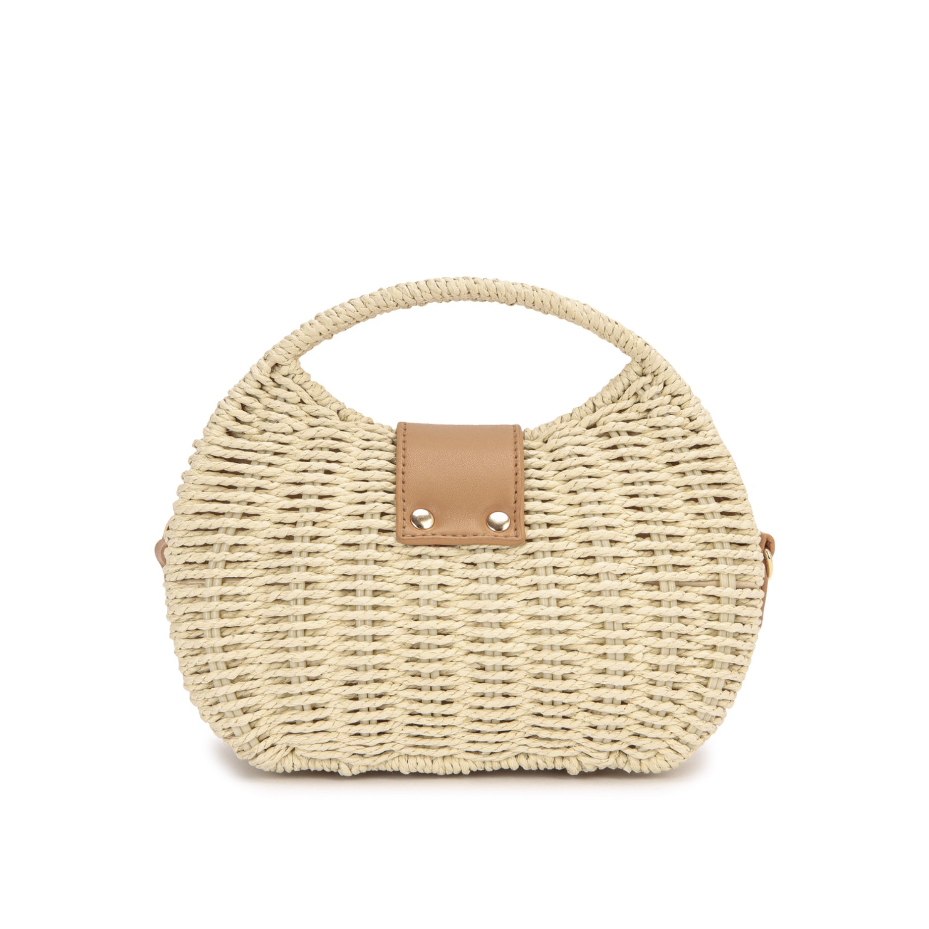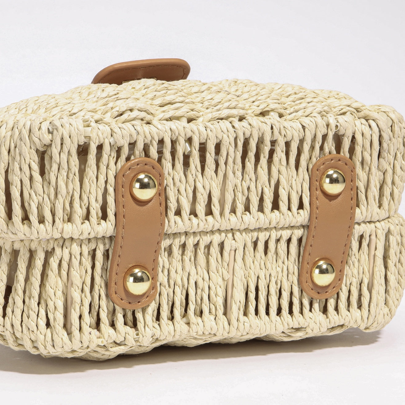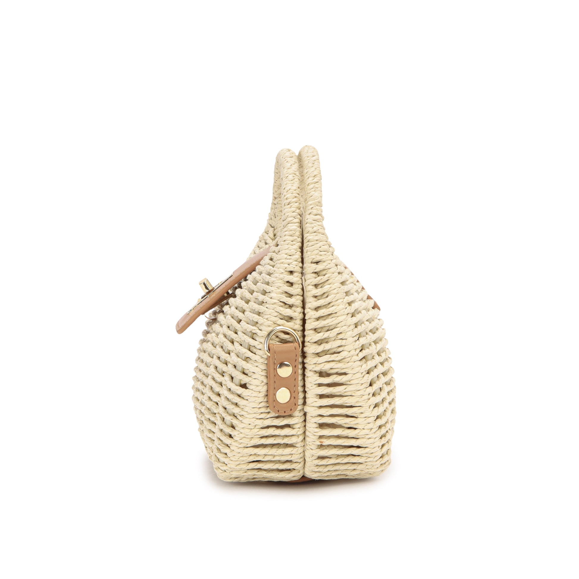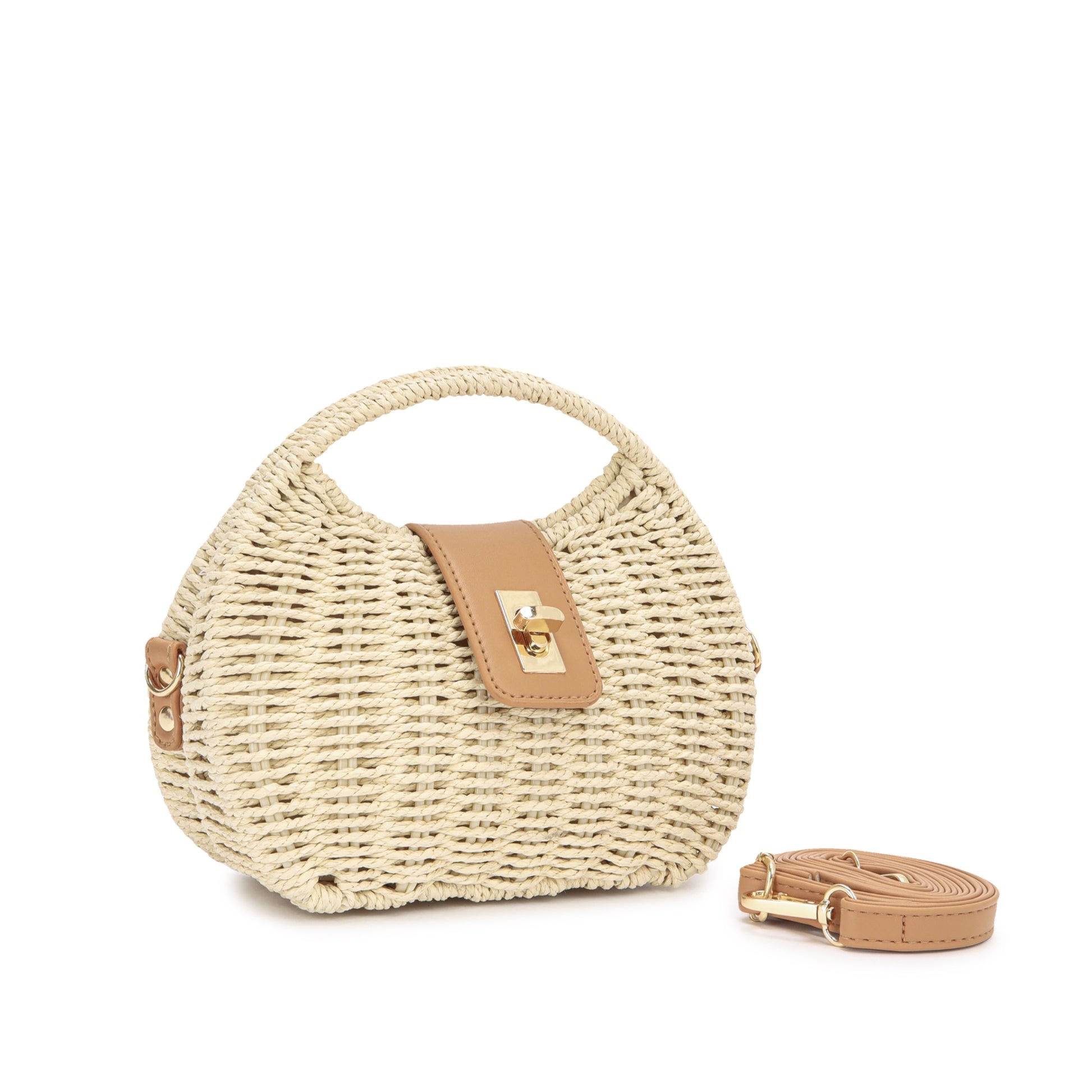 A Bolsa de Praia SP50106 é feita em palha sintética trançada, com design estruturado e acabamento sofisticado. Possui fecho metálico frontal, alça de mão e alça longa removível, permitindo usar tanto no ombro quanto transversalmente.